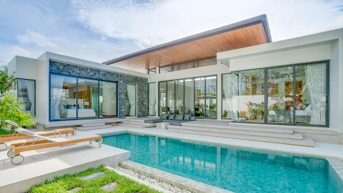 The complex consists of 37 single-storey loft-style villas with a private pool, high ceilings, open-plan living and dining areas complemented by a Western-style kitchen. A pantry and laundry room are located adjacent to the kitchen.