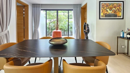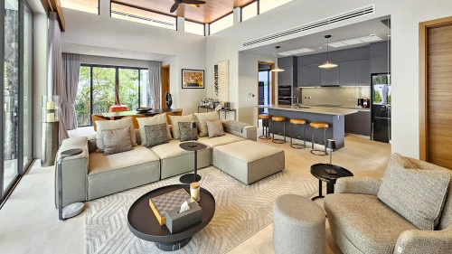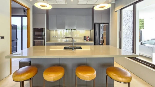 The central part of this single-storey The villa, located in the middle of the building, boasts a bright and airy open plan living and dining area with high ceilings, as well as a Western style kitchen with island/breakfast area.