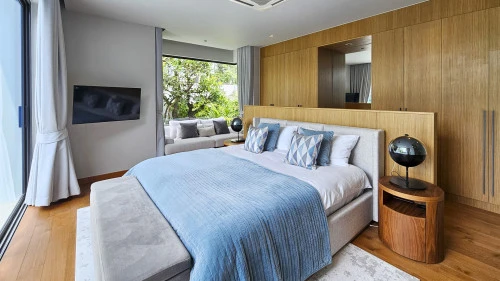 On the right wing of the villa there is a master bedroom and a guest bedroom. The master bedroom has a dressing room and a spacious bathroom with separate bath and shower, while the guest bedroom is located at the rear of the villa. building and has a private bathroom with shower.
