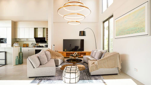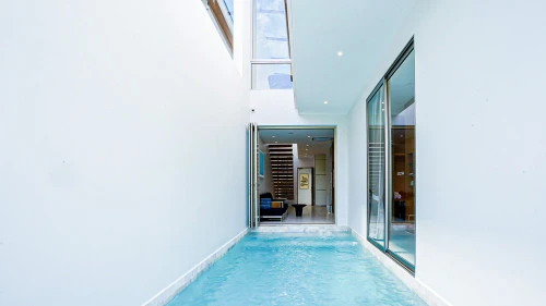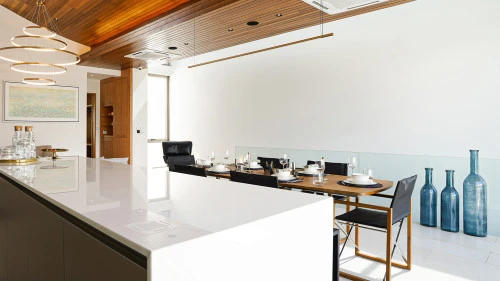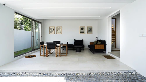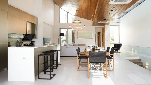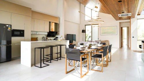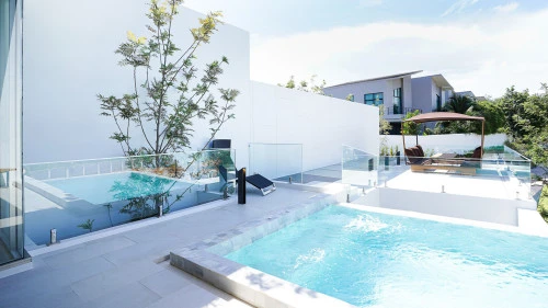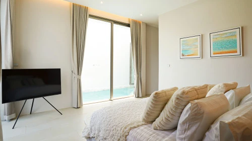 Each villa is spread over two levels and is decorated with modern elements. Villas come in different types. Interiors include one or two living rooms, one or two private pools, a dining room, a modern kitchen and three to four bedrooms, each with an en-suite bathroom. Some bedrooms have walk-in closets, and some bathrooms have bathtubs.
