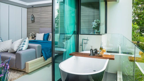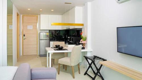 Each apartment has a living room, a kitchen in European style, is fully furnished and will be an ideal place for an unforgettable vacation or honeymoon! The stylish and modern apartment complex has its own infrastructure: a huge swimming pool, a fitness room, security 24 hours a day, a manager's office companies on the territory of the complex - everything for your comfortable stay.