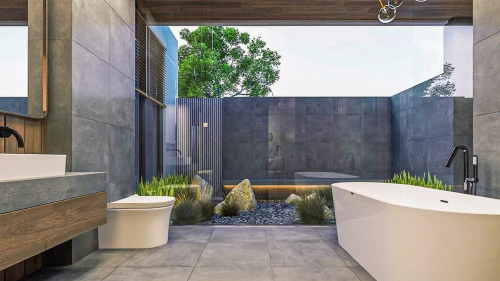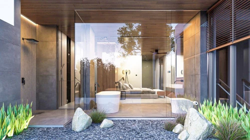 On the top floor there is a master bedroom, a living room, a room that can be converted into an office or an additional bedroom, a dressing room and a bathroom with a separate bath and outdoor shower.