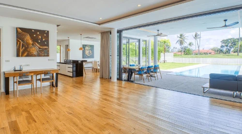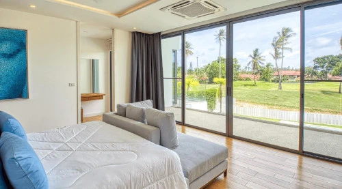 Built in 2002, the house has undergone many upgrades. Five years ago the Thai roof was replaced by a more practical Balinese-style roof with tiles that don't fade. Wooden windows have been replaced with aluminum frames, and the floors are now covered with termite-free tiles, which are better suited to tropical climates. Two of the three bathrooms have been completely renovated in a modern style. The top floor room has endless views of the fairway and hills and is decorated in pastel colors.