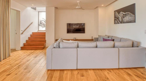 The lounge and driveway can comfortably accommodate three cars, while the low curved wall at the front retains stunning views of the garden. The electric door matches the size of the wall.