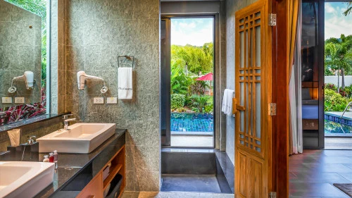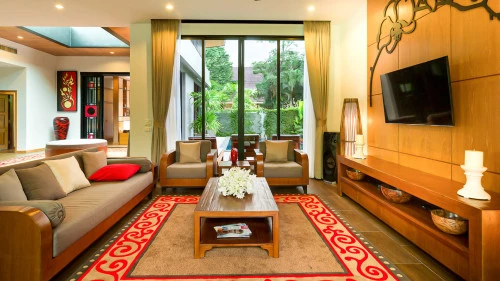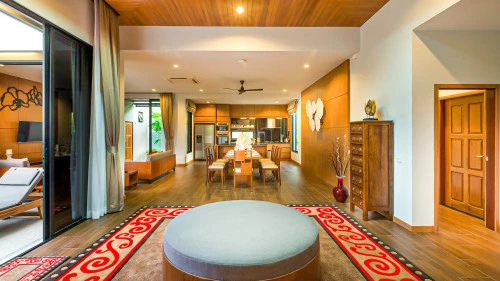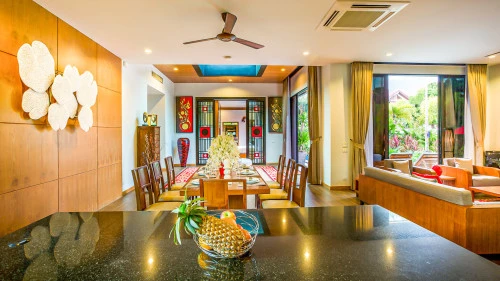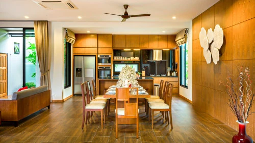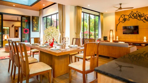 Inside the villa there is an open plan living and dining area, as well as a Western-style kitchen, each with access to an open terrace, which further emphasizes the combination of indoor and outdoor living.