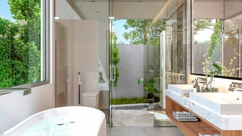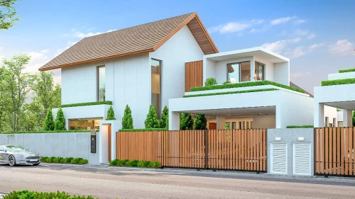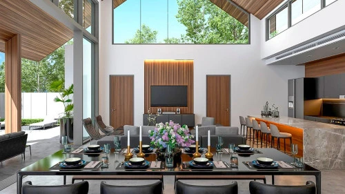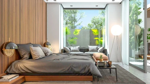Это двухэтажные виллы, с нижнего этажа можно выйти к бассейну. Также, на первом этаже располагается гостиная и столовая открытой планировки с высокими потолками, а также три спальни, включая главную спальню и две спальни для гостей. Главная спальня может похвастаться просторной планировкой, встроенными шкафами и ванной комнатой с отдельной ванной и душем.