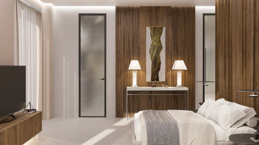 На верхнем этаже главная спальня и две гостевые спальни, каждая с собственной ванной комнатой. В главной спальне есть отдельная ванна и душ, а все спальни выходят на балконы, которые ведут на террасу на крыше. Планировка вилл ориентирована на уединение и комфорт, что делает их идеальными для семей, пар или отдельных лиц, ищущих современную жизнь в спокойной обстановке.