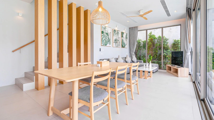 Двухуровневая вилла расположена всего в нескольких минутах езды от главной улицы Камалы и песчаного пляжа. На нижнем уровне расположены светлая и открытая гостиная и обеденная зона, кухня открытой планировки в западном стиле и вторая гостевая спальня, ванная комната которой делит ванную комнату с жилым помещением. Этот этаж выходит на частично крытую террасу у бассейна со встроенной гостиной и зоной отдыха на открытом воздухе. В панорамном бассейне есть джакузи. Всего в нескольких шагах от бассейна находится терраса, идеально подходящая для любителей загорать.