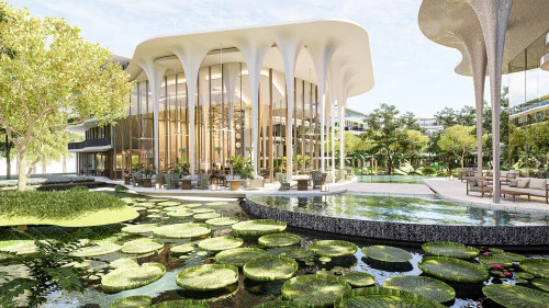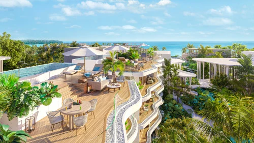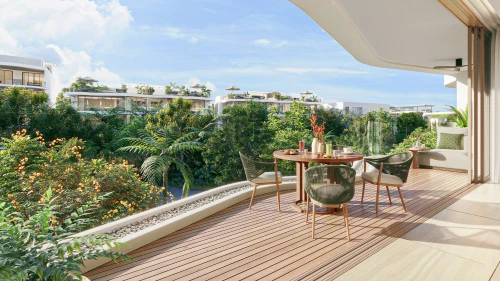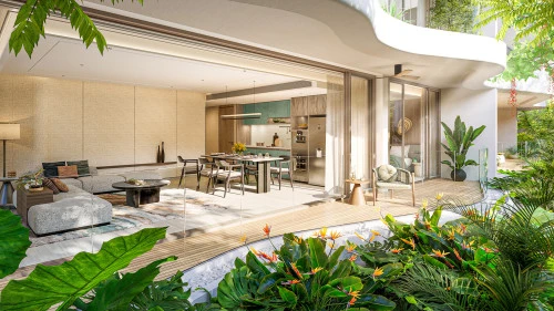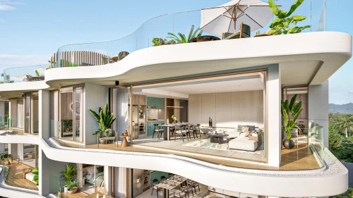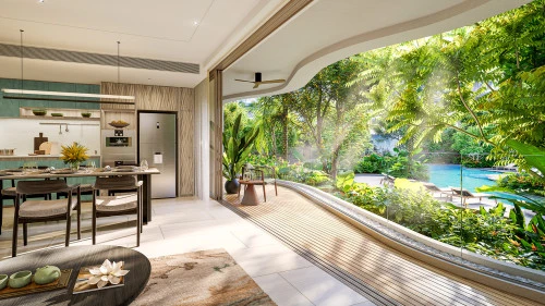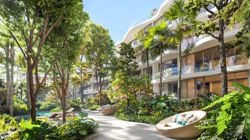 Кондоминиум представляет собой уникальное четырехэтажное здание в форме подковы, которое окружает пышный тропический сад и бассейн в форме реки с обширными террасами для отдыха. Этот дизайн создает ощущение погружения в тропический лес, которое усиливается за счет балкона каждой квартиры с волнообразным краем, гармонирующего с безмятежной обстановкой.