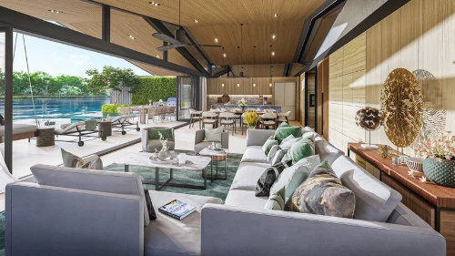 Одноэтажные виллы с бассейном спроектированы с большими открытыми пространствами, которые ведут из внутреннего двора через четыре просторные спальни к террасе у бассейна с потрясающим видом на озеро. Наклонные крыши позволяют естественному свету украсить мягкий интерьер просторной гостиной и столовой открытой планировки, а также стильной кухни. Ландшафтный дизайн вилл сочетается с зеленью окружающей среды, создавая спокойную атмосферу.