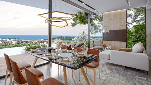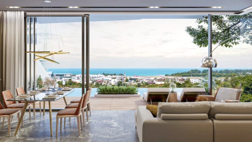 - Гостиная и обеденная зона открытой планировки с видом на море.