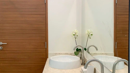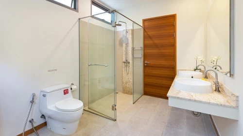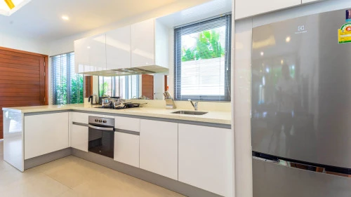 Эта двухуровневая вилла имеет современный Г-образный дизайн и расположена вокруг частного бассейна. На нижнем уровне располагается парковка, ведущего в пространство, где открытая кухня встречается со светлой гостиной и столовой открытой планировки, причем гостиная подчеркнута высоким сводчатым потолком, создавая ощущение простора.