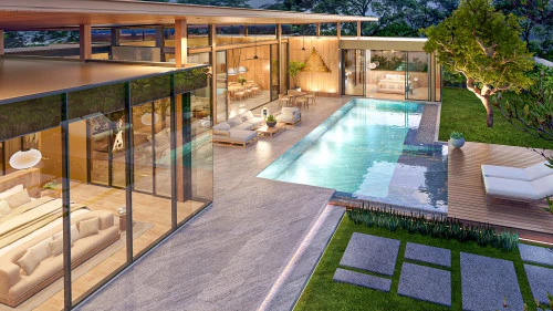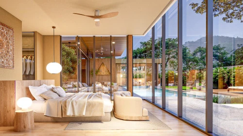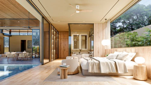 Планировка виллы включает две главные спальни, каждая из которых расположена на противоположных сторонах U-образной конструкции, что обеспечивает прямой доступ к частной террасе у бассейна или к самому бассейну. В обеих спальнях есть ванные комнаты, а в главных спальнях есть отдельная ванна и душ.