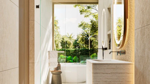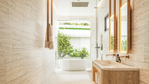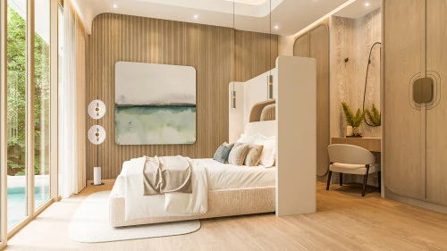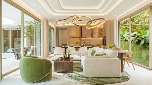 Каждая вилла состоит из 2 уровней в форме буквы L. На первом этаже находится просторная и светлая гостиная и столовая открытой планировки, современная кухня с островом/барной стойкой и первая гостевая спальня с собственной ванной комнатой с ванной. Из этой спальни можно выйти напрямую к большому 11-метровому бассейну.