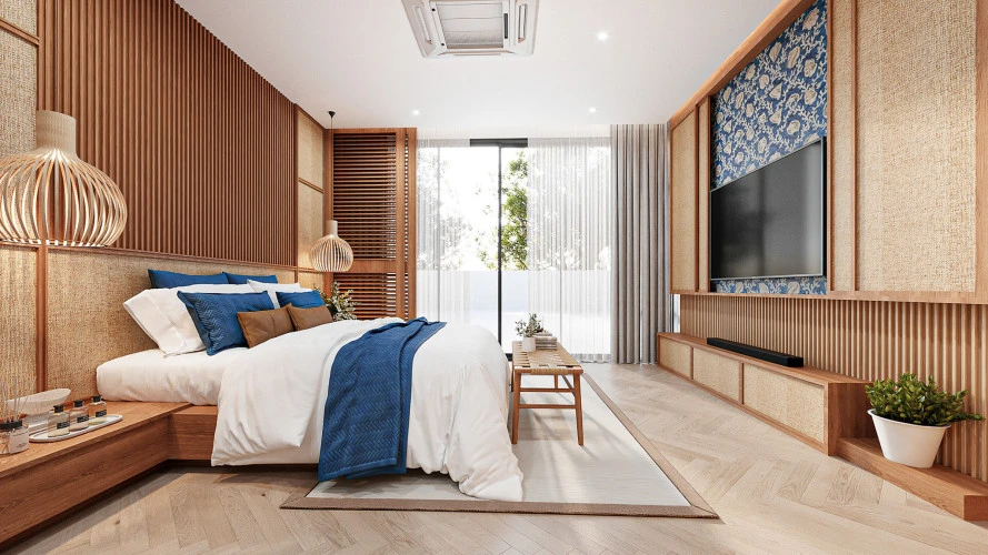 Этот бутик-комплекс состоит всего из 7 стильно оформленных вилл с бассейном, каждая из которых занимает два этажа. При входе вы увидите двойной навес для машины и просторную гостиную и столовую открытой планировки, дополненную кухней в западном стиле с барной стойкой и гостевыми спальнями на нижнем этаже. Гостиная и столовая, а также гостевая спальня выходят на большую террасу у бассейна, окружающую частный бассейн. В обеих спальнях есть ванные комнаты.