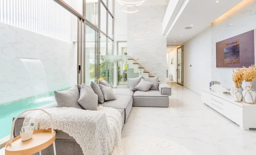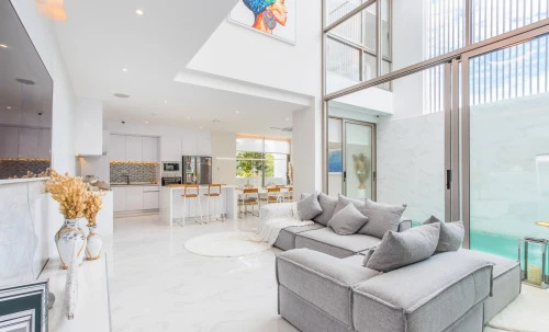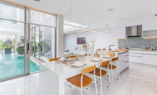 Первый уровень этих вилл предлагает практические удобства, в том числе двойной навес для машины, винный погреб, кладовую и автономную 2-ю гостевую спальню с отдельной гостиной и столовой, а также мини-кухню. Крытая лестница ведет на средний уровень, который может похвастаться светлой и просторной гостиной и столовой открытой планировки, а также кухней в европейском стиле с островом и барной стойкой. Жилая зона подчеркивается потолком двойной высоты, стеклянными стенами и большими дверями, ведущими к частному бассейну с водопадом, что создает безмятежную атмосферу для отдыха и развлечений.