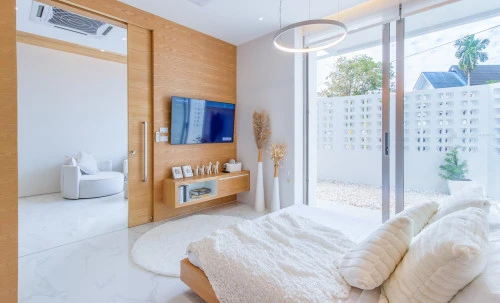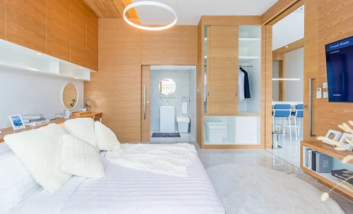 Верхний уровень вилл посвящен главной и 1-й гостевой спальням, которые спроектированы с открытым пространством двойной высоты, из которого открывается вид на гостиную зону внизу. В главной спальне есть гардеробная. Обе спальни имеют ванные комнаты с отдельными ваннами и душевыми кабинами, что обеспечивает ощущение комфорта и удобства. Проект Residence Prime Villas Cherng Talay — идеальный выбор для тех, кто ищет современный образ жизни в популярном месте на Пхукете.