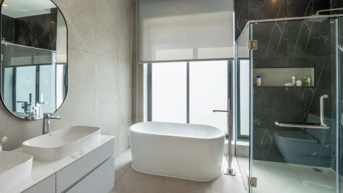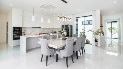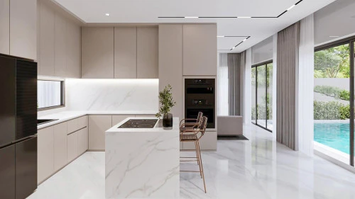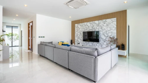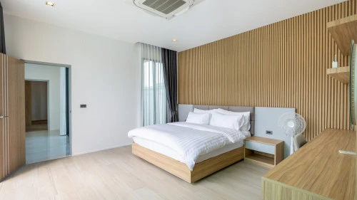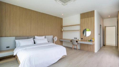 На вилле есть 5 оборудованные спальни, 3 из которых имеют ванные комнаты, а оставшаяся спальня использует общую ванную комнату. На вилле есть две кухни: главная западная кухня с островом/барной стойкой и обеденным столом, а также служебная/тайская кухня, расположенная в задней части дома.